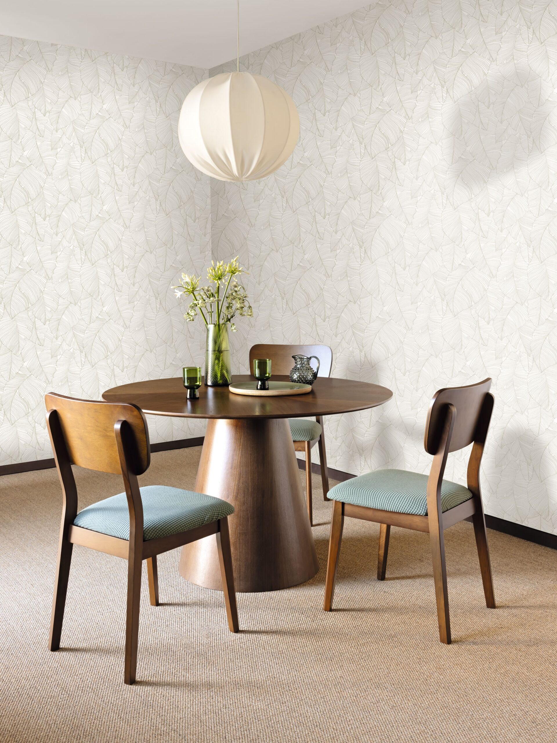 La principal ventaja de este diseño es su versatilidad decorativa. Al no tener colores opacos que cierren el espacio, el papel pintado botánico Vegetalia es perfecto para habitaciones pequeñas o con poca luz natural. Los pigmentos utilizados en los trazos de las hojas contrastan suavemente con fondos en tonos crema, blanco roto o gris perla, creando una atmósfera de calma absoluta. Este equilibrio visual lo convierte en el revestimiento predilecto para dormitorios principales y zonas de trabajo o estudio, donde se necesita una decoración que inspire serenidad sin llegar a distraer.
